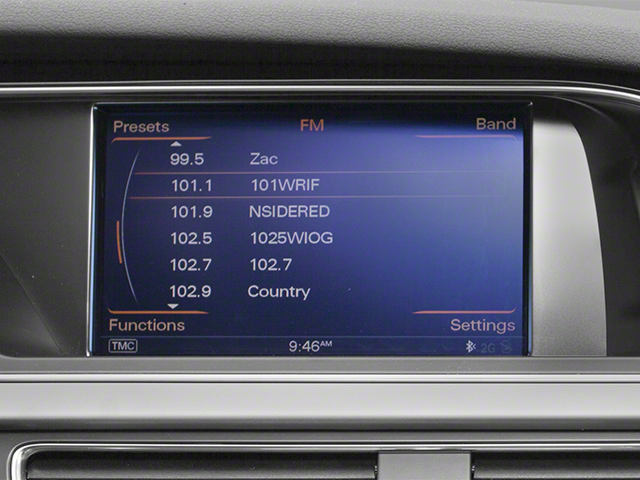 THIS VEHICLE INCLUDES THE FOLLOWING FEATURES AND OPTIONS: 10 Speakers, 4-Wheel Disc Brakes, 8.0J x 18 5-Arm-Rotor-Design Wheels, ABS brakes, Air Conditioning, Alloy wheels, AM/FM radio: SiriusXM, Anti-whiplash front head restraints, Automatic temperature control, Brake assist, Bumpers: body-color, CD player, Delay-off headlights, Driver door bin, Driver vanity mirror, Dual front impact airbags, Dual front side impact airbags, Electronic Stability Control, Four wheel independent suspension, Front anti-roll bar, Front Bucket Seats, Front Center Armrest, Front fog lights, Front reading lights, Headlight cleaning, Heated door mirrors, Illuminated entry, Knee airbag, Leather Seating Surfaces, Leather Shift Knob, Leather steering wheel, Low tire pressure warning, Occupant sensing airbag, Overhead airbag, Overhead console, Panic alarm, Passenger door bin, Passenger vanity mirror, Power door mirrors, Power driver seat, Power Front Seats, Power moonroof, Power passenger seat, Power steering, Power windows, Radio data system, Radio: Audi Concert System w/1CD Player, Rain sensing wipers, Rear anti-roll bar, Rear reading lights, Rear seat center armrest, Rear window defroster, Rear window wiper, Remote keyless entry, Roof rack: rails only, Security system, Speed control, Speed-sensing steering, Speed-Sensitive Wipers, Split folding rear seat, Spoiler, Steering wheel mounted audio controls, Tachometer, Telescoping steering wheel, Tilt steering wheel, Traction control, Turn signal indicator mirrors, and Variably intermittent wipers.