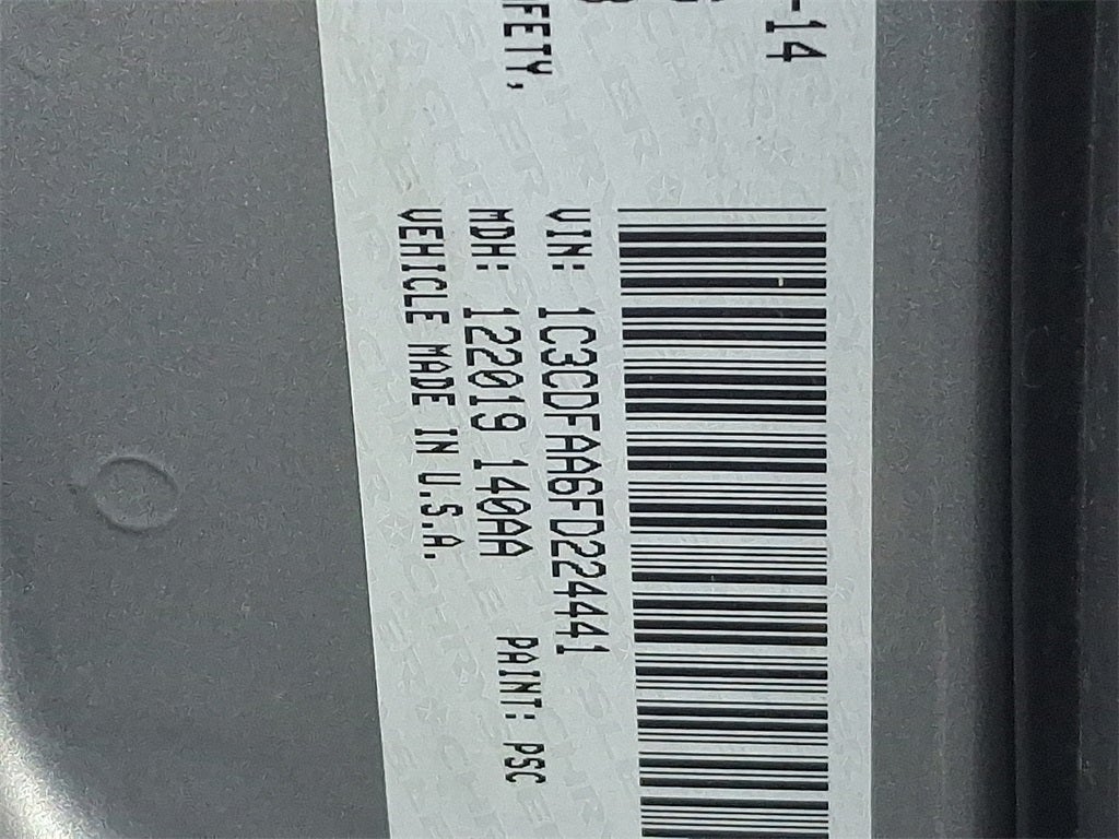 This Vehicle Includes the Following Options: Convenience Group (Active Grille Shutters, Air Conditioning w/Micron Filter, Body Color Door Handles, Body Color Power Mirrors, Keyless Entry w/Panic Alarm, Rear View Mirror w/Microphone, Remote USB Port, Speed Control, Speed Sensitive Power Locks, Steering Wheel Mounted Audio Controls, Uconnect Voice Command w/Bluetooth®, and Underbody Aerodynamic Treatment), Quick Order Package 25A, 16 x 7.0 Steel Wheels, 16 Silver Wheel Covers, 4 Speakers, 4-Wheel Disc Brakes, ABS brakes, AM/FM radio, Anti-whiplash front head restraints, Brake assist, Bumpers: body-color, CD player, Delay-off headlights, Driver door bin, Driver vanity mirror, Dual front impact airbags, Dual front side impact airbags, Electronic Stability Control, Four wheel independent suspension, Front anti-roll bar, Front Bucket Seats, Front Center Armrest, Front reading lights, Knee airbag, Low tire pressure warning, Occupant sensing airbag, Outside temperature display, Overhead airbag, Passenger door bin, Passenger vanity mirror, Power steering, Power windows, Radio data system, Radio: Uconnect 200 AM/FM/CD/MP3, Rear reading lights, Rear side impact airbag, Rear window defroster, Speed-sensing steering, Speed-Sensitive Wipers, Sport Cloth Seats, Tachometer, Telescoping steering wheel, Tilt steering wheel, Traction control, and Variably intermittent wipers.