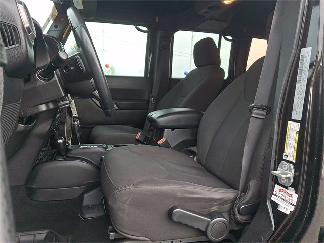 THIS VEHICLE INCLUDES THE FOLLOWING FEATURES AND OPTIONS: Connectivity Group (Remote USB Port, Tire Pressure Monitoring Display, Uconnect Voice Command w/Bluetooth®, and Vehicle Information Center), Quick Order Package 23C, Quick Order Package 24S (17 x 7.5 Aluminum Wheels, Auto-Dimming Mirror w/Reading Lamp, Chrome/Leather Wrapped Shift Knob, Deep Tint Sunscreen Windows, Front 1-Touch Down Power Windows, Leather Wrapped Steering Wheel, Power Convenience Group, Power Heated Mirrors, Power Locks, Remote Keyless Entry, and Security Alarm), 1-Yr SiriusXM Radio Service, 16 x 7.0 Luxury Styled Steel Wheels, 3.21 Rear Axle Ratio, 4-Wheel Disc Brakes, 8 Speakers, ABS brakes, Air Conditioning, AM/FM radio, Brake assist, CD player, Cloth Seats w/Adjustable Head Restraints, Compass, Driver door bin, Driver vanity mirror, Dual front impact airbags, Electronic Stability Control, Front anti-roll bar, Front Bucket Seats, Front Center Armrest w/Storage, Front fog lights, Integrated roll-over protection, Low tire pressure warning, Normal Duty Suspension, Occupant sensing airbag, Outside temperature display, Passenger door bin, Passenger vanity mirror, Power steering, Premium Black Sunrider Soft Top, Radio: 130, Rear anti-roll bar, SIRIUS Satellite Radio, Speed control, Split folding rear seat, Steering wheel mounted audio controls, Tachometer, Tilt steering wheel, Traction control, Trip computer, and Variably intermittent wipers.
