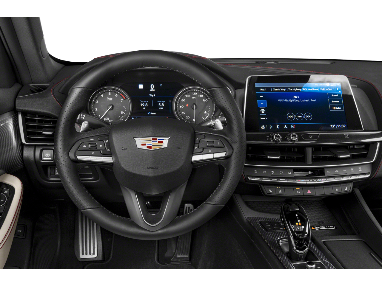 This vehicle includes the following features: Climate Package (Driver Power Lumbar Massage Seat, Front Passenger Power Lumbar Massage Seat, Heated Driver & Front Passenger Seats, Heated Steering Wheel, and Ventilated Driver & Front Passenger Seats), Driver Awareness Plus Package w/o Super Cruise (Following Distance Indicator, IntelliBeam Auto High Beam Assist, and Lane Keep Assist w/Lane Departure Warning), Lighting Package (Front Cornering LED Lamps, Illuminating Door Handles, and Illuminating Front Sill Plates), Navigation & Bose Premium Audio Package (Wireless Phone Charging), Preferred Equipment Group 1SF (Automatic Emergency Braking, Body-Color Heated Pwr-Adjustable Outside Mirrors, Dual Diagonal Color Driver Information Center, HD Rear Vision Camera, Inside Rear-View Auto-Dimming Mirror, Leather-Wrapped Thick Rim Steering Wheel, LED Reflective Windshield Alert, Manual Tilt & Telescoping Steering Column, and Rear Park Assist), Premium Package, Radio: Cadillac User Experience w/Embedded Nav (Bose Performance Series Premium 15-Speaker System and SiriusXM w/360L), Technology Package (12 Diagonal HD Color Reconfigurable Driver Cluster and Head-Up Display), 4-Wheel Disc Brakes, 9 Speakers, ABS brakes, Adaptive suspension, Air Conditioning, Alloy wheels, AM/FM radio: SiriusXM with 360L, Apple CarPlay/Android Auto, Auto-dimming door mirrors, Auto-dimming Rear-View mirror, Automatic Stop/Start w/Disable, Automatic temperature control, Blue Brembo Calipers, Brake assist, Bumpers: body-color, Compass, Delay-off headlights, Driver 4-Way Power Lumbar Seat Adjuster, Driver door bin, Driver vanity mirror, Dual front impact airbags, Dual front side impact airbags, Electronic Stability Control, Emergency communication system: OnStar and Cadillac connected services capable, Exterior Parking Camera Rear, Four wheel independent suspension, Front anti-roll bar, Front Bucket Seats, Front Center Armrest, Front dual zone A/C, Front Passenger 4-Way Power Lumbar Seat Adjuster, Front reading lights, Fully automatic headlights, Garage door transmitter, HD Radio, Heated door mirrors, Illuminated entry, Knee airbag, Leather steering wheel, Leatherette Seating Surfaces, Low tire pressure warning, Memory seat, Occupant sensing airbag, Outside temperature display, Overhead airbag, Overhead console, Panic alarm, Passenger door bin, Passenger vanity mirror, Power door mirrors, Power driver seat, Power passenger seat, Power steering, Power windows, Premium 9-Speaker Audio System Feature, Radio data system, Radio: Cadillac User Experience, Rain sensing wipers, Rear anti-roll bar, Rear reading lights, Rear seat center armrest, Rear window defroster, Remote keyless entry, Speed control, Speed-sensing steering, Split folding rear seat, Spoiler, Steering wheel mounted audio controls, Tachometer, Telescoping steering wheel, Tilt steering wheel, Traction control, Trip computer, Turn signal indicator mirrors, UltraView Dual Pane Sunroof, Variably intermittent wipers, Voltmeter, Wheels: 19 Alloy w/Pearl Nickel Finish, and Wheels: 19 Alloy w/Satin Graphite Finish.
