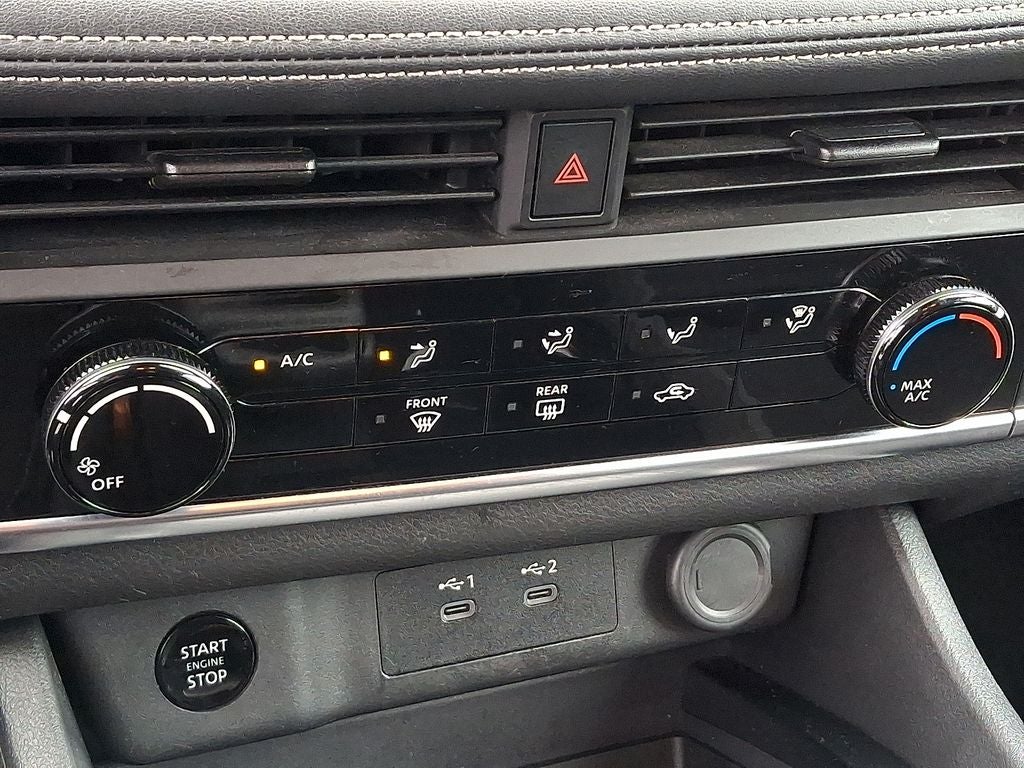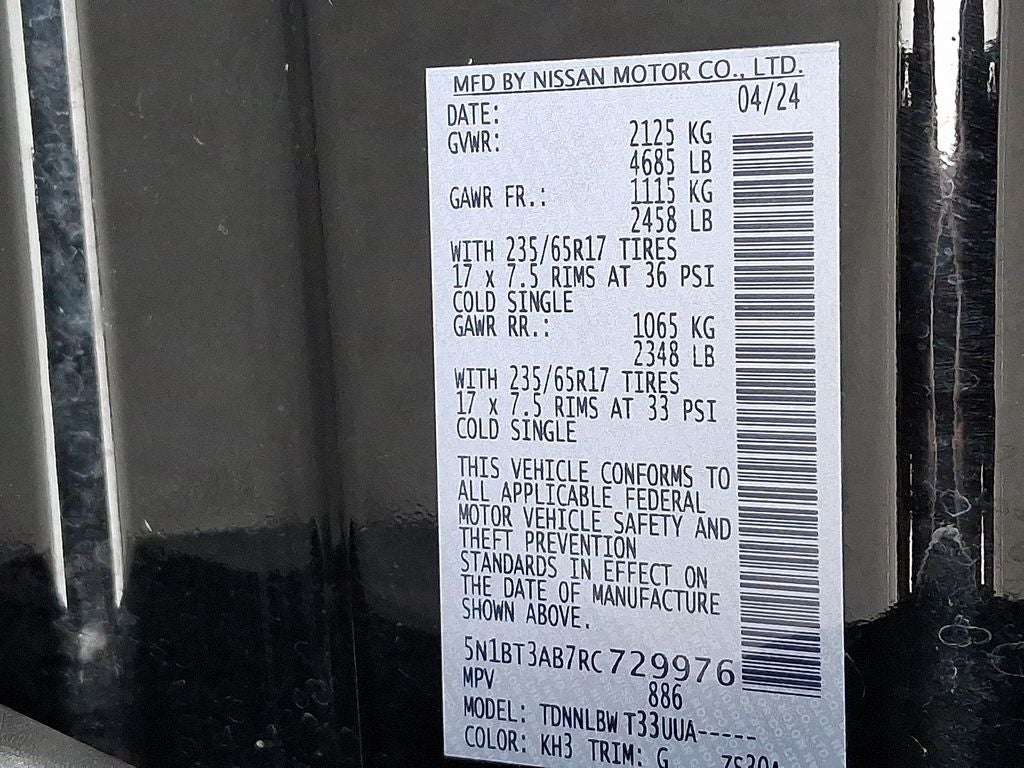 THIS VEHICLE INCLUDES THE FOLLOWING FEATURES AND OPTIONS: AWD, 17 Aluminum Alloy Wheels, 4 Speakers, 4-Wheel Disc Brakes, 5.676 Axle Ratio, ABS brakes, Air Conditioning, Alloy wheels, AM/FM radio: SiriusXM, Auto High-beam Headlights, Blind Spot Warning, Brake assist, Bumpers: body-color, Cloth Seat Trim, Delay-off headlights, Driver door bin, Driver vanity mirror, Dual front impact airbags, Dual front side impact airbags, Electronic Stability Control, First Aid Kit, Floor Mats w/1-Piece Cargo Area Protector, Four wheel independent suspension, Front anti-roll bar, Front Bucket Seats, Front Center Armrest, Front reading lights, Fully automatic headlights, Illuminated entry, Knee airbag, Low tire pressure warning, NissanConnect featuring Apple CarPlay and Android Auto, Occupant sensing airbag, Outside temperature display, Overhead airbag, Overhead console, Panic alarm, Passenger door bin, Passenger vanity mirror, Power door mirrors, Power steering, Power windows, Radio data system, Radio: AM/FM NissanConnect, Rear anti-roll bar, Rear Parking Sensors, Rear seat center armrest, Rear side impact airbag, Rear window defroster, Rear window wiper, Remote keyless entry, Speed control, Speed-Sensitive Wipers, Split folding rear seat, Spoiler, Steering wheel mounted audio controls, Tachometer, Telescoping steering wheel, Tilt steering wheel, Traction control, Trip computer, and Variably intermittent wipers. 28/35 City/Highway MPG