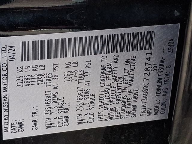 THIS VEHICLE INCLUDES THE FOLLOWING FEATURES AND OPTIONS: AWD, 17 Aluminum Alloy Wheels, 4 Speakers, 4-Wheel Disc Brakes, 5.676 Axle Ratio, ABS brakes, Air Conditioning, Alloy wheels, AM/FM radio: SiriusXM, Auto High-beam Headlights, Blind Spot Warning, Brake assist, Bumpers: body-color, Cloth Seat Trim, Delay-off headlights, Driver door bin, Driver vanity mirror, Dual front impact airbags, Dual front side impact airbags, Electronic Stability Control, First Aid Kit, Floor Mats w/1-Piece Cargo Area Protector, Four wheel independent suspension, Front anti-roll bar, Front Bucket Seats, Front Center Armrest, Front reading lights, Fully automatic headlights, Illuminated entry, Knee airbag, Low tire pressure warning, NissanConnect featuring Apple CarPlay and Android Auto, Occupant sensing airbag, Outside temperature display, Overhead airbag, Overhead console, Panic alarm, Passenger door bin, Passenger vanity mirror, Power door mirrors, Power steering, Power windows, Radio data system, Radio: AM/FM NissanConnect, Rear anti-roll bar, Rear Parking Sensors, Rear seat center armrest, Rear side impact airbag, Rear window defroster, Rear window wiper, Remote keyless entry, Speed control, Speed-Sensitive Wipers, Split folding rear seat, Spoiler, Steering wheel mounted audio controls, Tachometer, Telescoping steering wheel, Tilt steering wheel, Traction control, Trip computer, and Variably intermittent wipers.