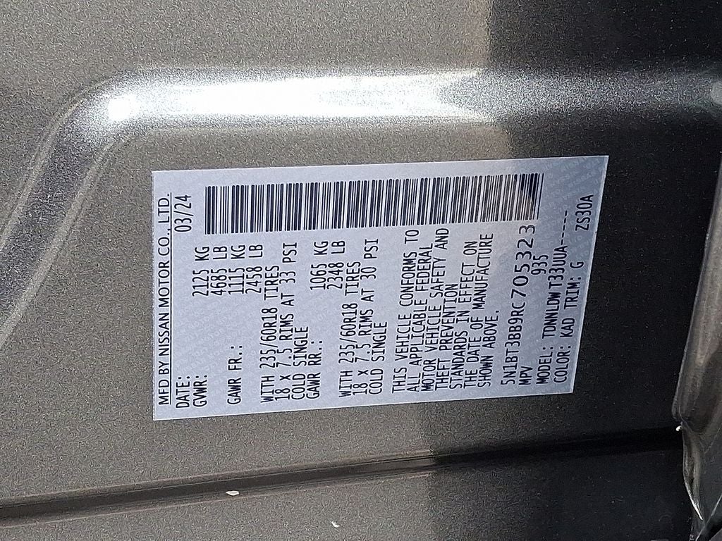 THIS VEHICLE INCLUDES THE FOLLOWING FEATURES AND OPTIONS: AWD, 4-Wheel Disc Brakes, 5.676 Axle Ratio, 6 Speakers, ABS brakes, Air Conditioning, Alloy wheels, AM/FM radio: SiriusXM, Auto High-beam Headlights, Automatic temperature control, Brake assist, Bumpers: body-color, Cloth Seat Trim w/Patterned Inserts, Delay-off headlights, Driver door bin, Driver vanity mirror, Dual front impact airbags, Dual front side impact airbags, Electronic Stability Control, Emergency communication system: NissanConnect Services, First Aid Kit, Floor Mats w/1-Piece Cargo Area Protector, Four wheel independent suspension, Front anti-roll bar, Front Bucket Seats, Front Center Armrest, Front dual zone A/C, Front reading lights, Fully automatic headlights, Heated door mirrors, Illuminated entry, Knee airbag, Low tire pressure warning, NissanConnect featuring Apple CarPlay and Android Auto, Occupant sensing airbag, Outside temperature display, Overhead airbag, Overhead console, Panic alarm, Passenger door bin, Passenger vanity mirror, Power door mirrors, Power driver seat, Power Liftgate, Power steering, Power windows, Radio data system, Radio: AM/FM NissanConnect, Rear anti-roll bar, Rear Parking Sensors, Rear seat center armrest, Rear side impact airbag, Rear window defroster, Rear window wiper, Remote keyless entry, Speed control, Speed-Sensitive Wipers, Split folding rear seat, Spoiler, Steering wheel mounted audio controls, Tachometer, Telescoping steering wheel, Tilt steering wheel, Traction control, Trip computer, Variably intermittent wipers, and Wheels: 18 Dark Painted Machine Finished Alloy. 28/35 City/Highway MPG